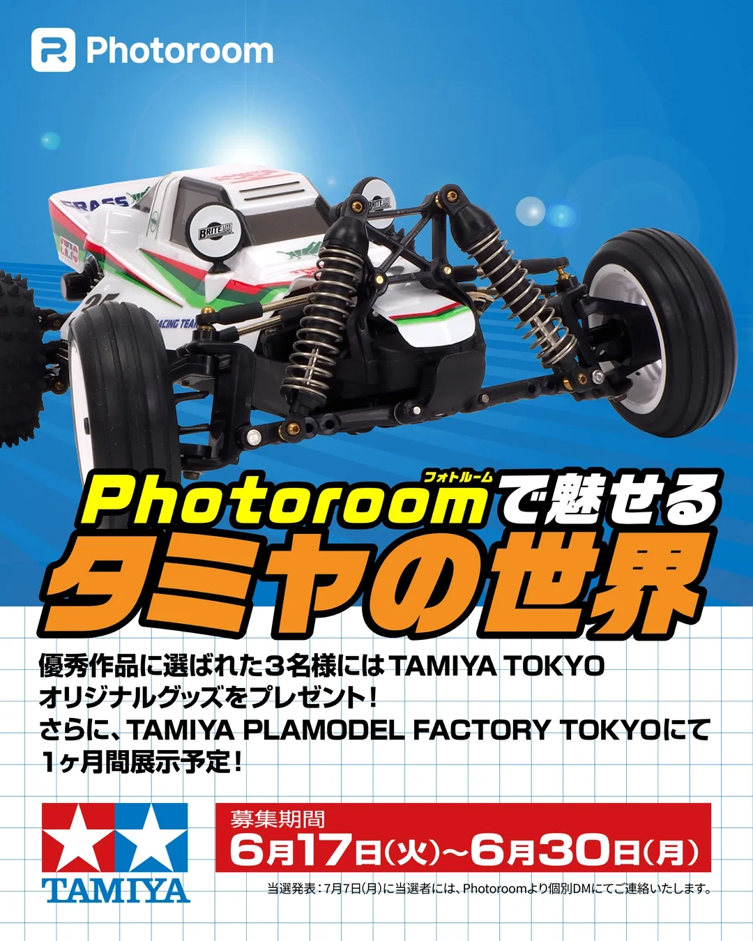 長年に渡り模型業界を牽引している株式会社タミヤ(TAMIYA)と、写真編集・加工アプリPhotoroom(フォトルーム)とのコラボレーション企画「TAMIYA × Photoroom 投稿キャンペーン」用のクリエイティブ制作を担当しました。