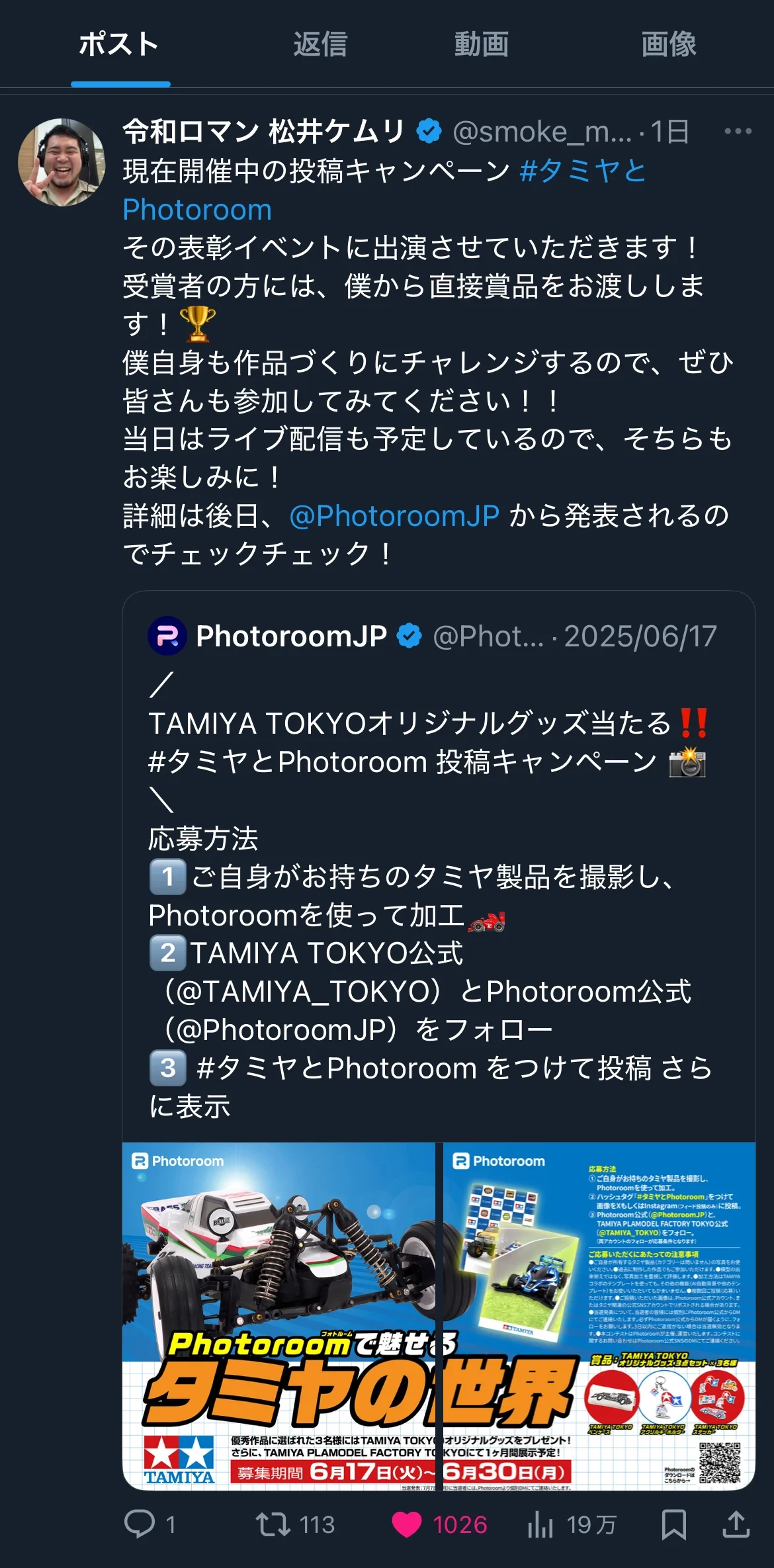 参加者が所有するTAMIYAのプラモデルをPhotoroomで加工し、TAMIYAのオリジナルテンプレートやAI自動背景を活用してX/ Instagramへ投稿するというキャンペーンの訴求ポイントをヴィジュアル化。表彰イベントはTAMIYA PLAMODEL FACTORY TOKYOにて吉本興業所属芸人のケムリ氏をプレゼンターに迎えてYoutubeにてライブ配信。参加された方々の優秀な技術や視点にも感動を覚えました。